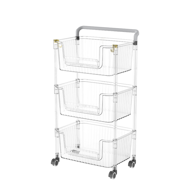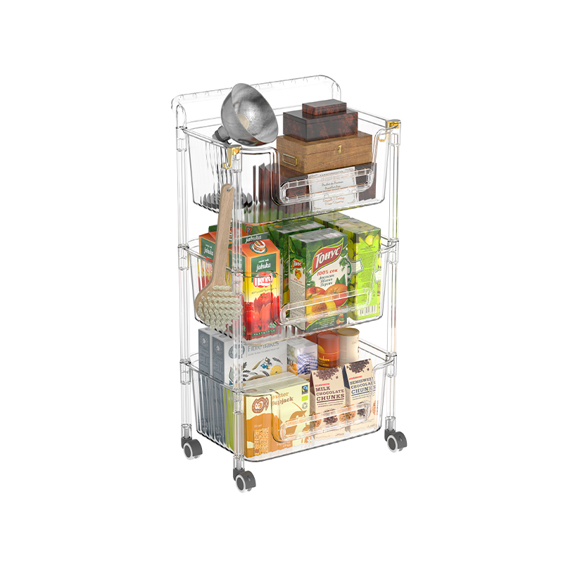 Läpinäkyvä muotoilu on tämän säilytyskärryn ominaisuus. Läpinäkyvät muovilevyt voivat selvästi näyttää jokaiselle säilytyshyllylle asetetut esineet, jolloin käyttäjät voivat nopeasti löytää tarvitsemansa esineet, mikä säästää esineiden löytämiseen tarvittavaa aikaa ja energiaa. Tämä on tärkeää tilanteissa, joissa vaaditaan nopea pääsy esineisiin, kuten keittiössä mausteiden ja ainesosien varastoimiseksi tai toimistossa asiakirjojen ja toimistotarvikkeiden tallentamiseksi. Läpinäkyvä muotoilu lisää myös visuaalista siisteyttä, jolloin kokonaistila näyttää järjestyksellisemmästä.